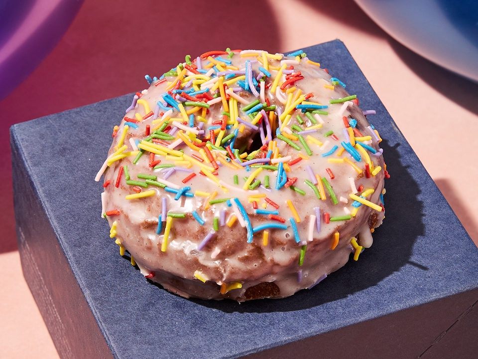 Funfetti sprinkle vanilla cake donut, vanilla bean glaze & topped with Crunchies all-natural rainbow sprinkles. Made just for our 10th Birthday Week!