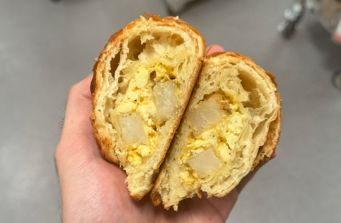 Homemade buttered croissant stuffed with cage-free scrambled eggs, diced roasted potatoes & cheddar cheese