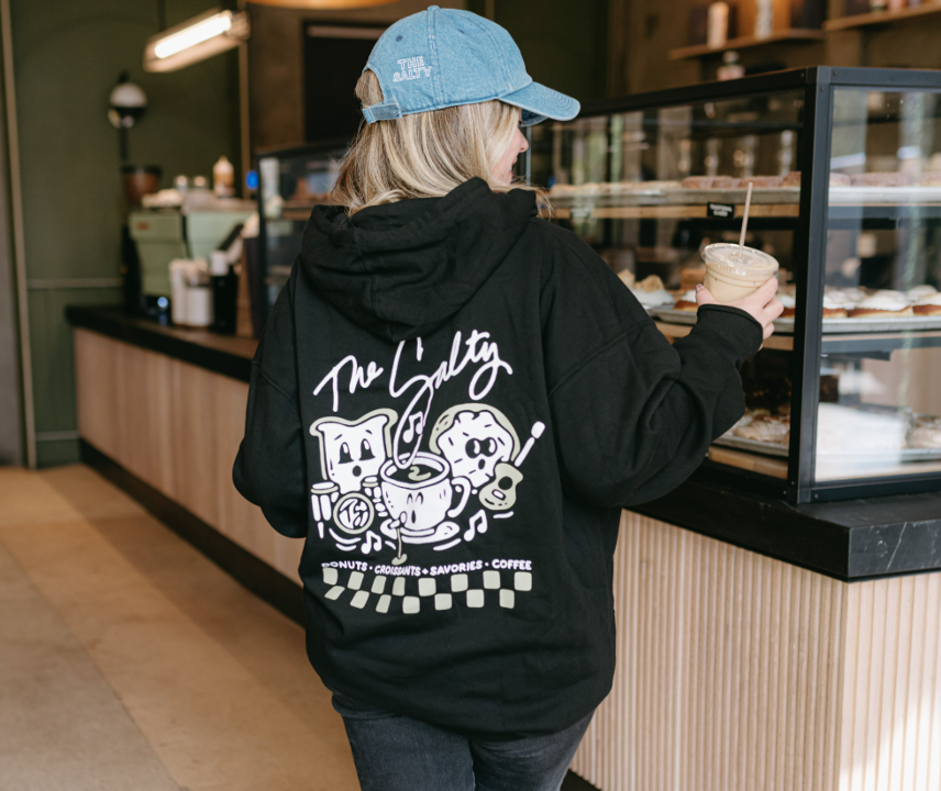 The band is back, on your back. The Salty House Band Hoodie features a clean front with The Salty’s signature script, and a back graphic starring our all-day café crew (yes, even the croissant’s on guitar). Cozy, bold, and packed with flavor—just like our menu.
